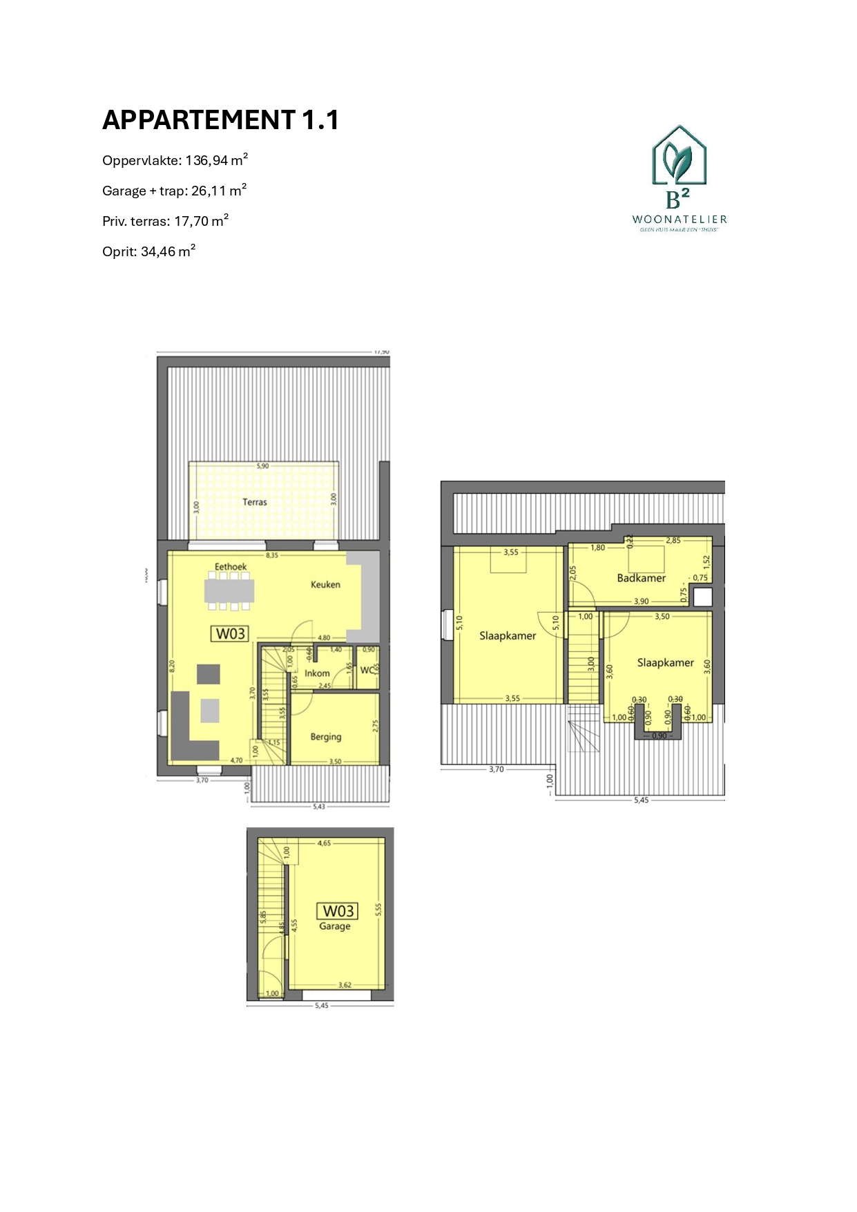 Appartement 1.1 is het linker-duplex-appartement en heeft op het gelijkvloers ( inpandige garage) + 1ste en 2de verdiep een bewoonbare oppervlakte van 136m² + 26 m² ( garage+ trap).